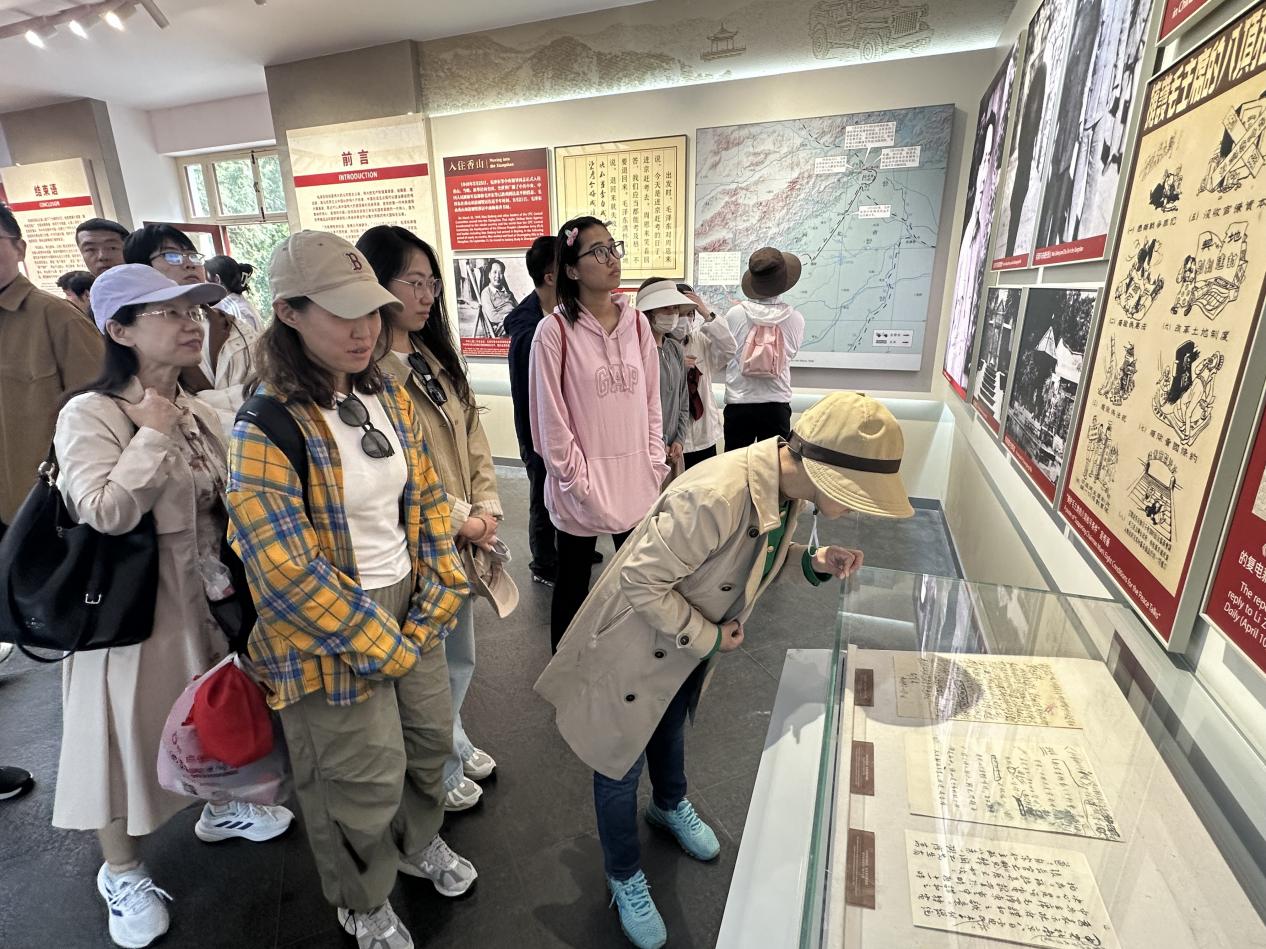 师生一行首先来到中共中央机关及毛泽东同志办公居住地——双清别墅。在讲解员引导下,师生驻足于毛泽东同志《论人民民主专政》手稿复刻展前,凝视泛黄纸页上“人民至上”的铿锵笔迹;在毛泽东同志会见民主人士的六角红亭前,重温“协商建国”的历史抉择。肖建杰教授、于红教授结合实景展开展实地教学,在现场教学中讲到,双清别墅见证了中国革命从农村转向城市的关键转折,在这里我们更能深刻体会“两个务必”的深邃内涵。吕天石、张莹、钟锡进等青年教师化身现场讲解员答疑解惑。随后,师生移步来青轩,瞻仰朱德、刘少奇、周恩来、任弼时等老一辈革命家办公居住地。斑驳的木门、简朴的陈设,无声诉说着“小米加步枪”到“进京赶考”的艰辛跨越,生动再现了1949年党中央“进京赶考”的历史场景。